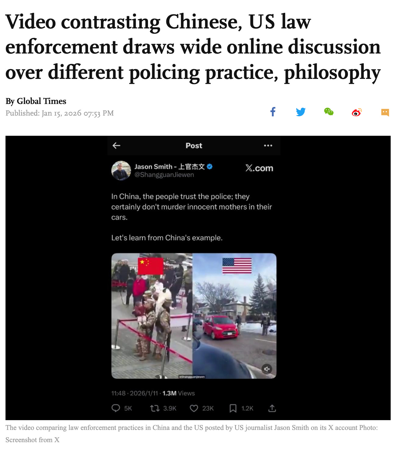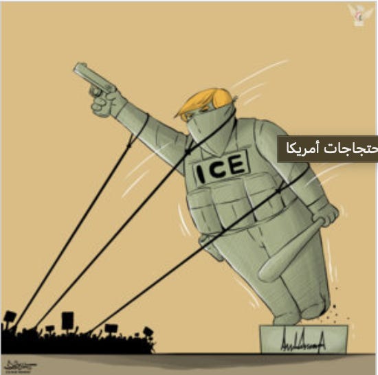Other powers are joining in on. China’s Global Times showcased footage from a pro-PRC commentator contrasting Chinese and American police behavior: In their framing, order versus chaos. Russia’s RIA Novosti noted that “while the world was being told about the Iranian protests, such unrest broke out within the U.S.,” then proceeded to call Minneapolis a “civil war dress rehearsal.” Houthi media circulated coverage of the protests in the US in negative commentary, and a cartoon of Trump as a toppling statue in ICE gear, gun drawn, being pulled down by crowds, the iconography of regime collapse, repurposed for American consumption. Different systems, different audiences, same function: degrade the coherence of American power.