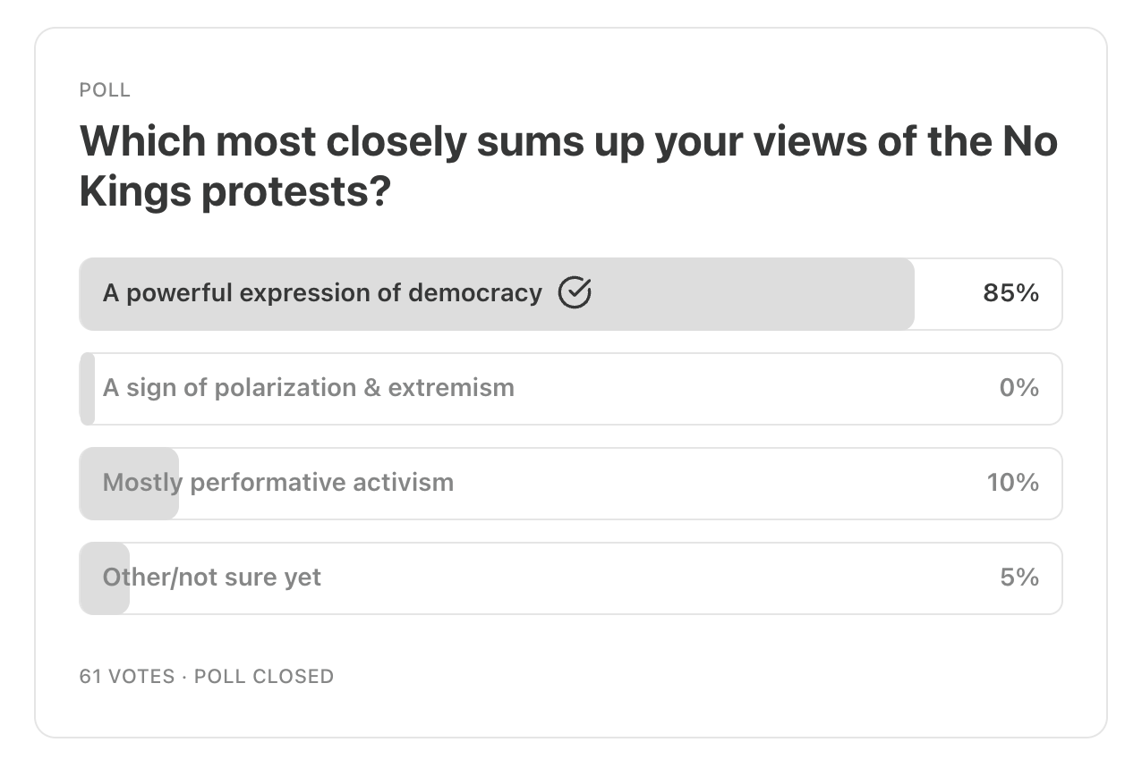You’re probably not surprised that many people see the No Kings protests as a powerful expression of democracy. Peaceful protest is integral to a free society, and those protests were big! But 10% skeptical is not nothing—and we should take stock of what kinds of what activism really move the needle, and what is more theater.