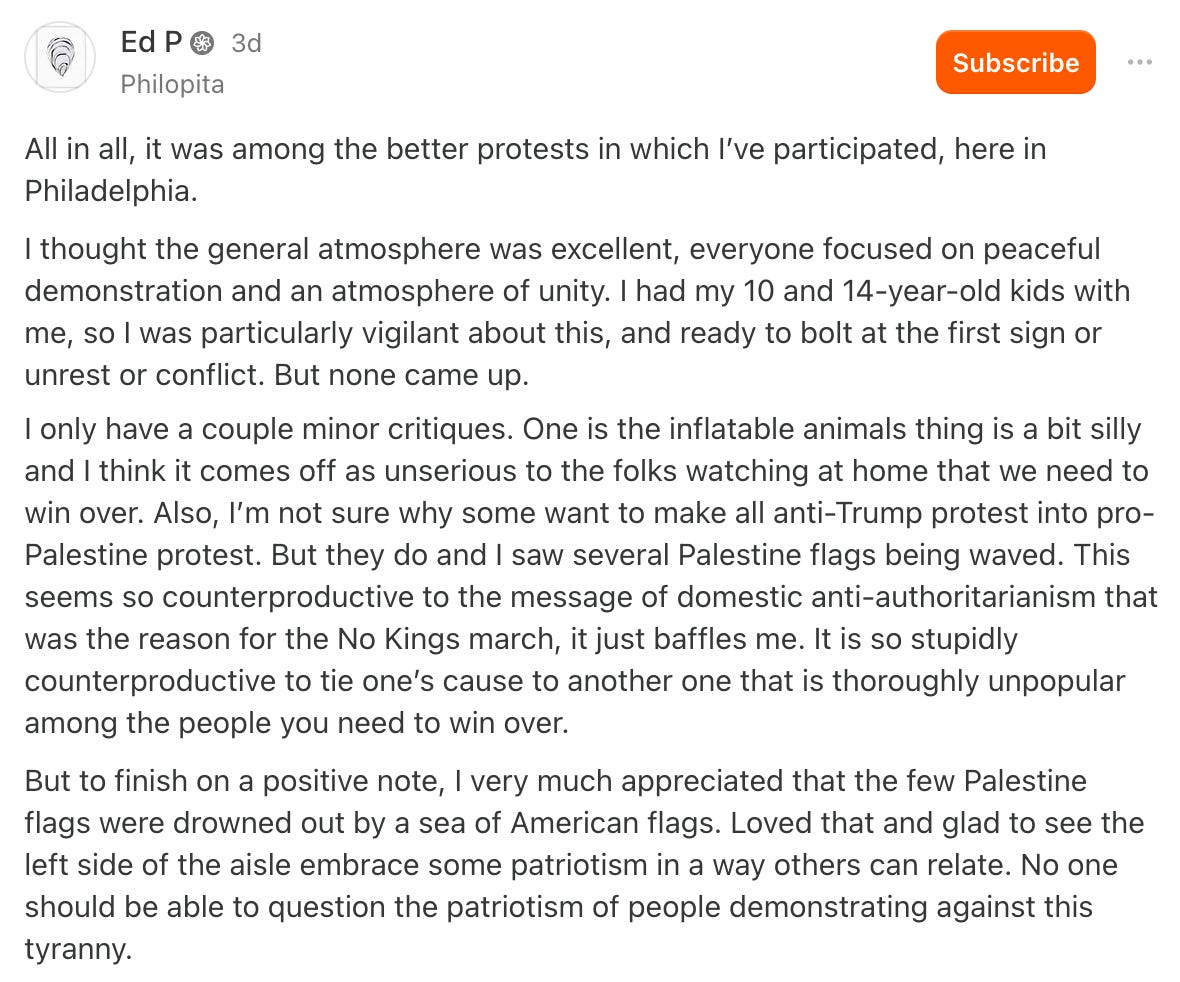 Renew Democracy Initiative Director of Communications Evan Gottesman asked readers about their experiences with the No Kings protests.