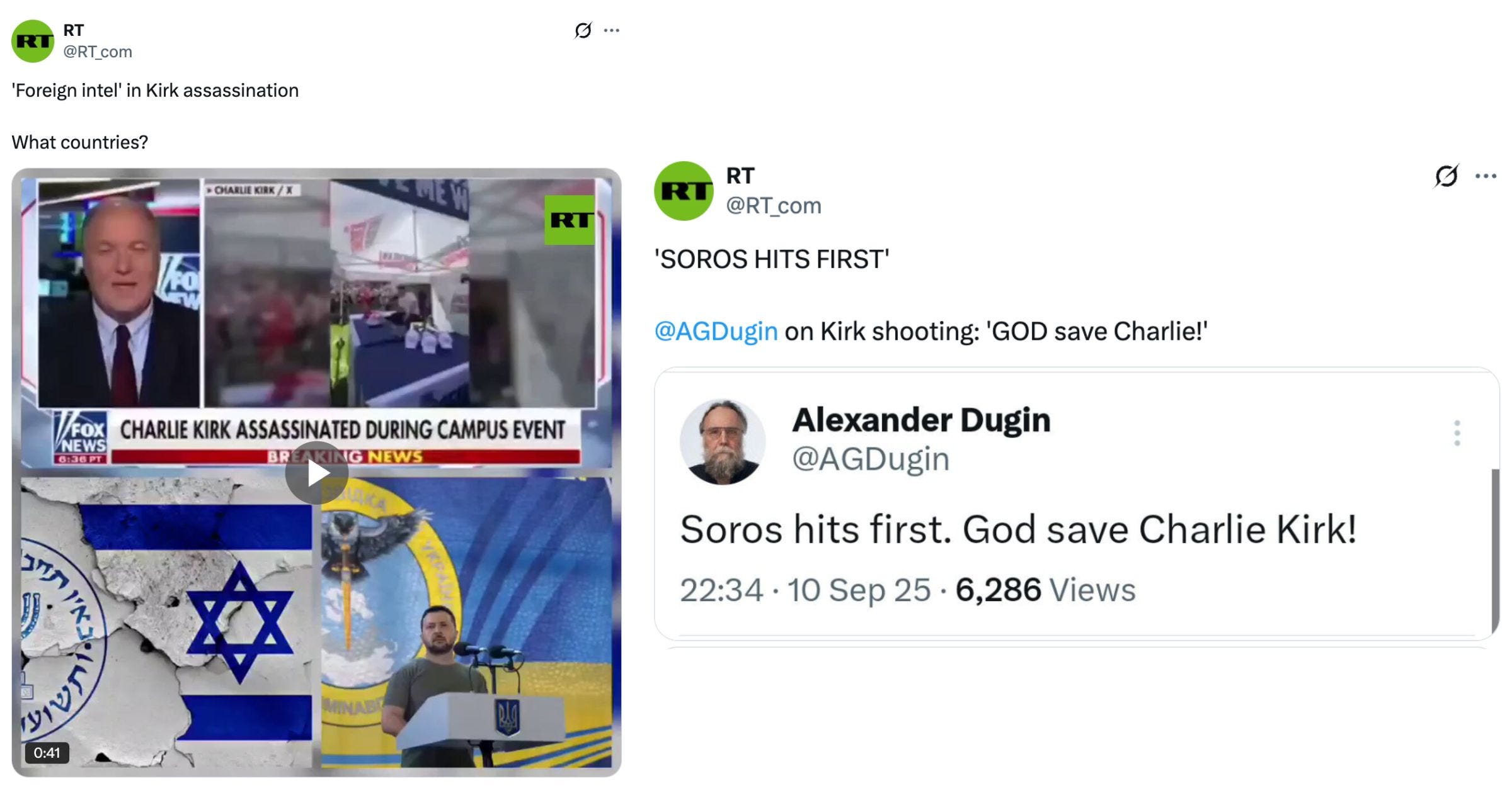 Well, RT had another menu to rile up the Jew-haters in the crowd too. Maybe the Israelis killed Charlie Kirk. Or Volodymyr Zelenskyy. Or perhaps it was Soros, as Kremlin ideologue Alexander Dugin suggested.