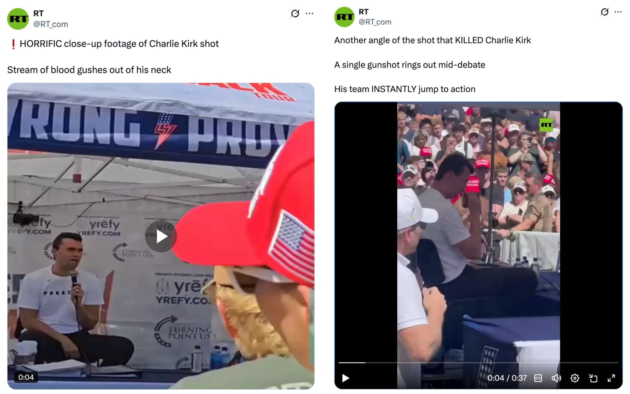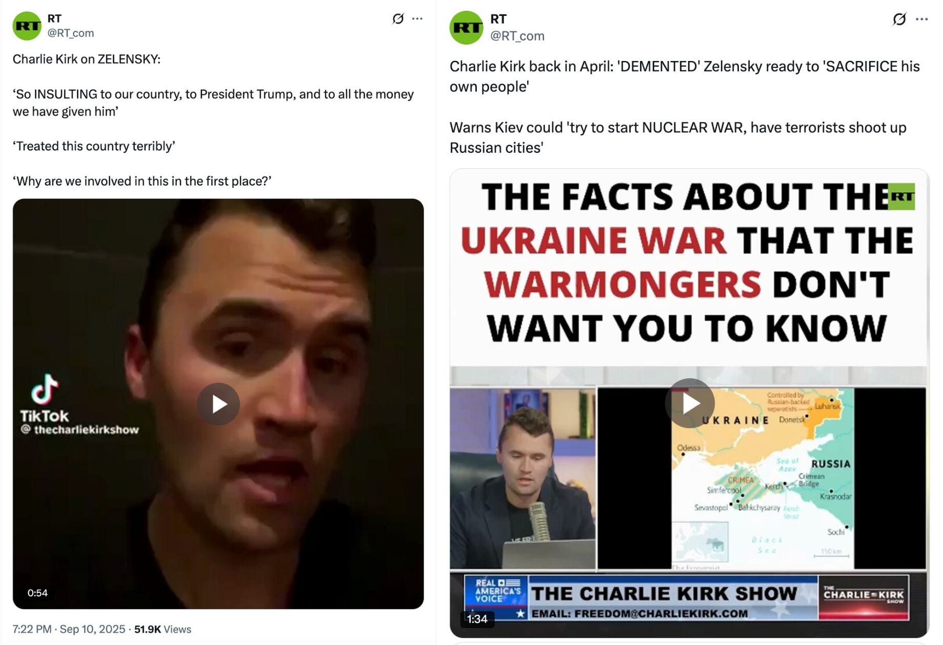 In life, Charlie Kirk parroted Putin’s talking points about the War in Ukraine. In the hours after the shooting, RT re-upped Kirk’s Kyiv-bashing content. RT’s logic seems to go as follows: If you were inclined to feel a little more sympathetic for Kirk because of the way he died, perhaps you’ll be a bit more receptive to his views on Ukraine.