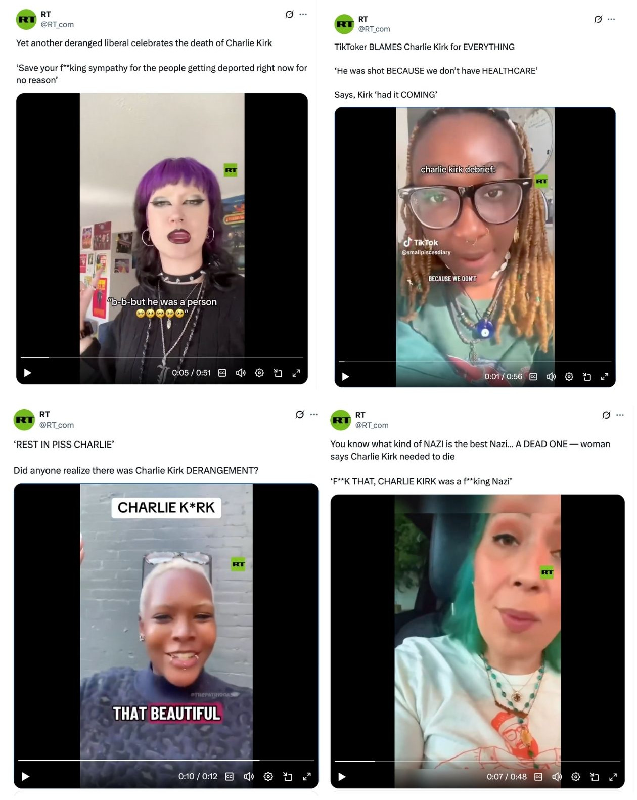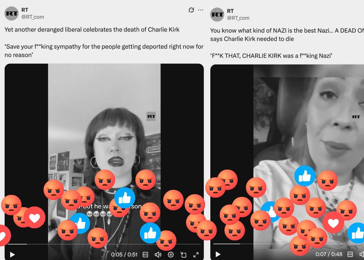 And RT didn’t just give a spotlight to far-right figures like Tate. RT also blasted out left-wing social media users short on sympathy for Kirk.