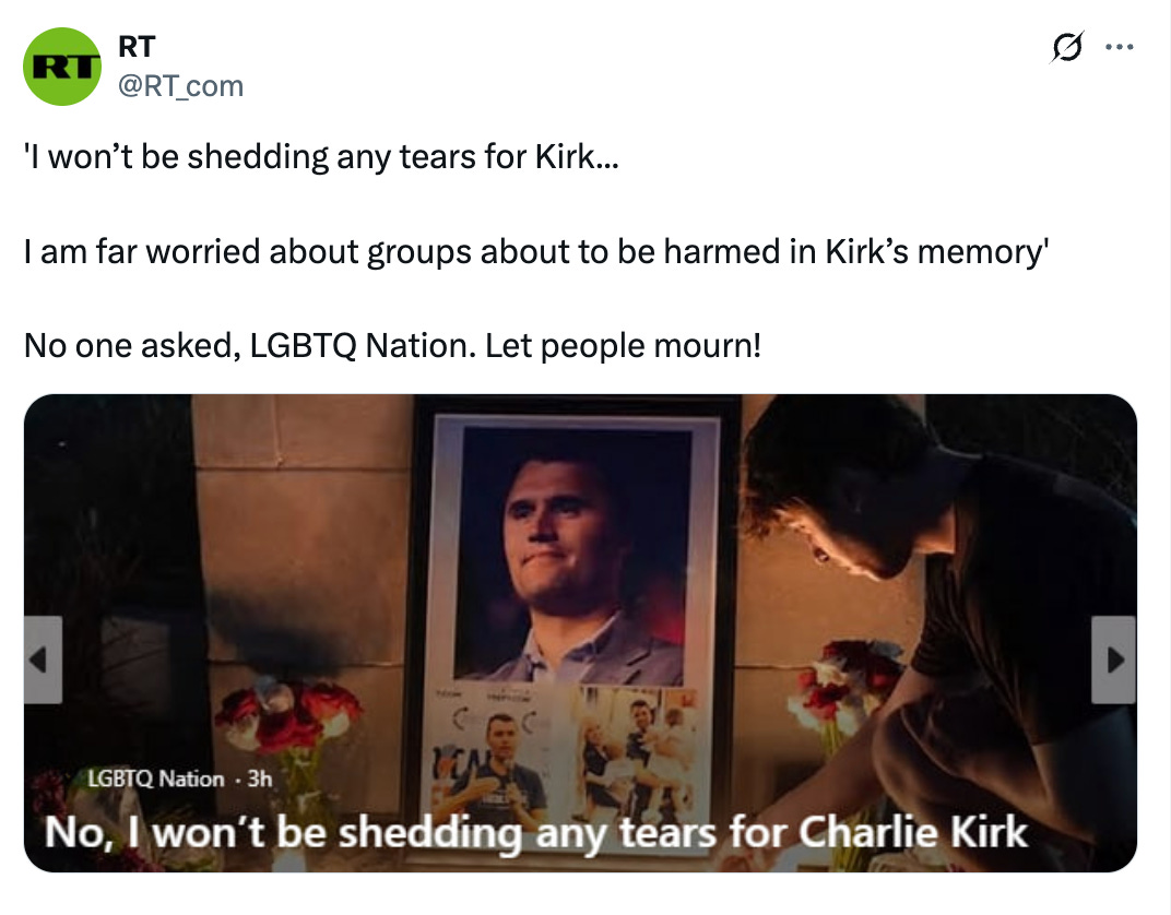 One RT tweet wasn’t doing anything to hide the ball. Responding to an account called “LGBTQ Nation,” which declared that it would not be mourning Kirk’s loss, the Russians chided: