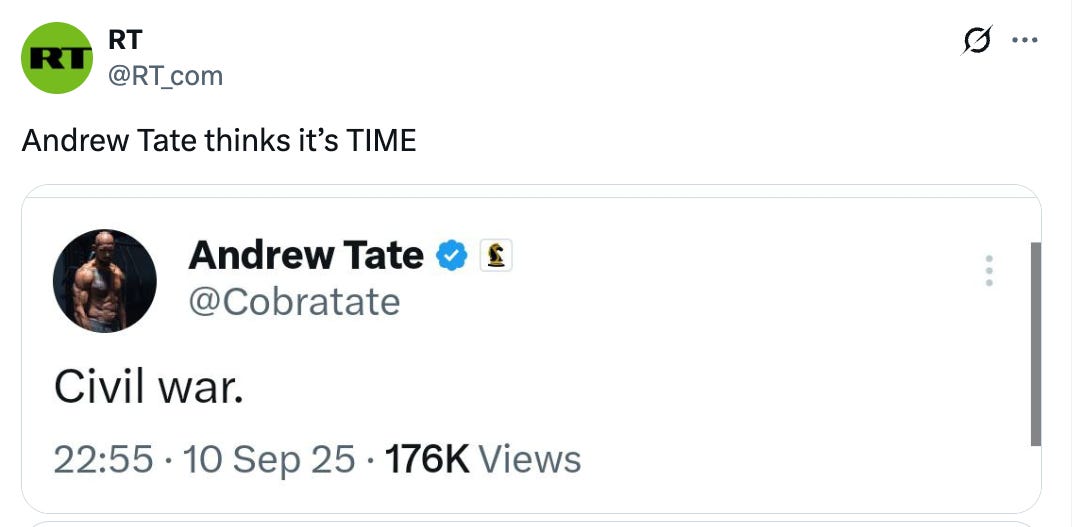 Above a screenshot of a two-word tweet—“civil war”—RT exhorted Americans to internecine violence: “Andrew Tate thinks it’s TIME.”